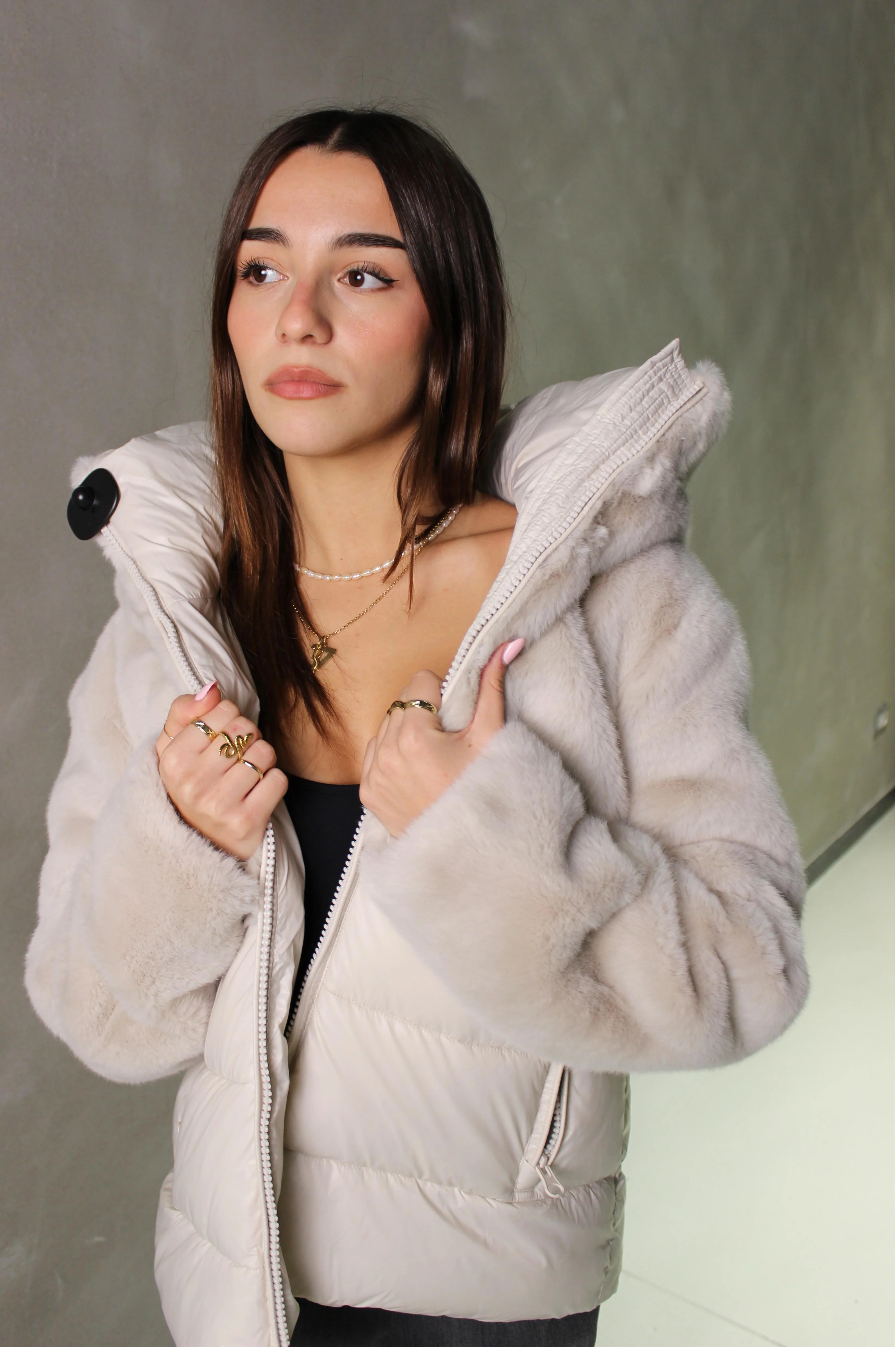 GIUBBETTO NYLON CON PELLICCIA ECO FANEVIL.Giubbetto in ecopelliccia nella parte superiore e in nylon lucido nella parte inferiore. Caldo cappuccio ed impuntura sotto a righe orizzontali; capo pensato per proteggere dagli inverni più rigidi senza rinunciare allo stile. Cappuccio fisso in pelliccia ecologia con coulisse Realizzato in nylon ed eco pelliccia Foderato in nylon lucido in tono Imbottito ovatta Sorona® Aura Chiusura con zip Tasche con zip e copri cursore Fondo manica doppio con elastico interno Coulisse sul fondo Tasche interne con velcro